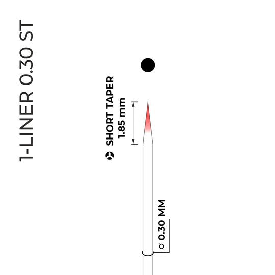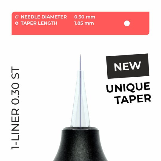 Our new 1-LINER 0.30 Short Taper features a unique taper length in our needle portfolio and in the PMU market. It covers the gap between you and perfection! We designed this needle to implant colour into the most difficult skin types, for areola procedures and to create super intense shades in less time. Say goodbye to the numerous passes and trauma to reach those desired results.